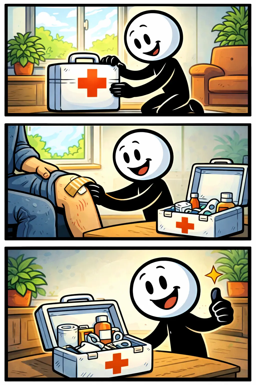 A first aid kit is a sturdy box containing bandages, plasters and medical supplies to treat minor injuries quickly and safely.