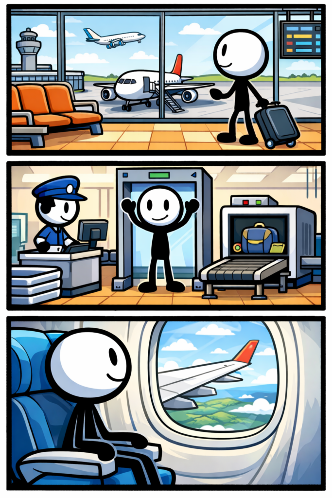 Op het vliegveld begint elk avontuur, zelfs als de stoelen vandaag eigenwijs achterstevoren blijken te staan.